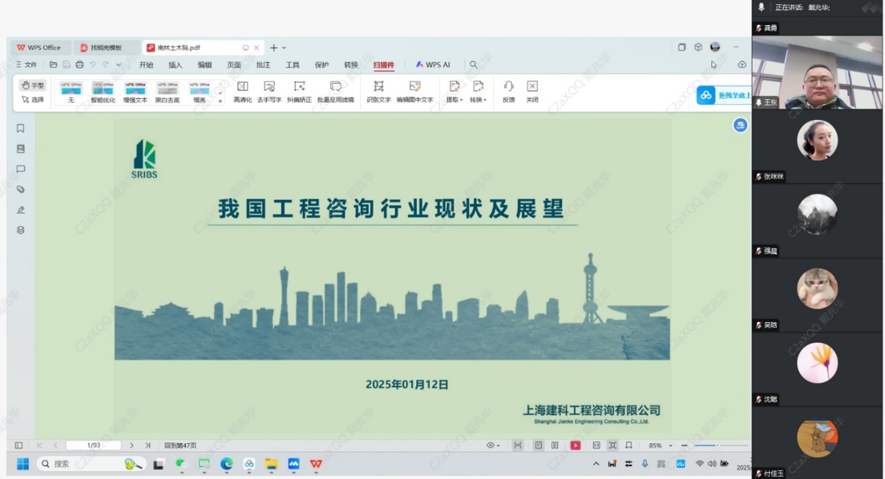 2025年1月12日下午皇冠博彩网址 2006级森林工程专业、2010级建筑与土木工程硕士专业校友、上海建科工程咨询有限公司高级工程师王东应邀为皇冠博彩网址 师生作了一场以“我国工程咨询行业现状及展望”为主题的讲座,土木皇冠博彩网址 本科生和研究生60余人参加了本次在线讲座活动,活动由皇冠博彩网址 副院长戴兆华主持。