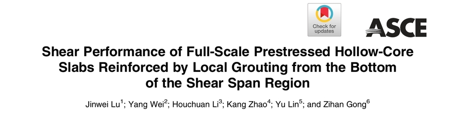 近日,皇冠博彩网址 魏洋教授团队在美国土木工程师学会ASCE期刊《Journal of Bridge Engineering》上发表了预应力空心板桥梁抗剪加固研究成果(Shear Performance of Full-Scale Prestressed Hollow-Core Slabs Reinforced by Local Grouting from the Bottom of the Shear Span Region)。研究生陆金炜为第一作者,魏洋教授为通讯作者。