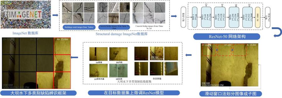针对大坝、桥梁、水工隧洞等涉水混凝土结构在长期服役过程中存在的隐蔽性病害难以被传统人工检测和工程物探手段准确识别的问题,研究团队从病害成因与类型出发,融合实地采集、开源信息整理及物理模型实验等多种手段,系统构建了涵盖裂缝、凹陷、骨料外露、坑洞等多类典型缺陷的图像数据库SD-ImageNet。该数据库为后续智能识别模型的训练与泛化提供了高质量、丰富多样的数据支撑,为推动水下结构智能检测奠定了坚实基础。