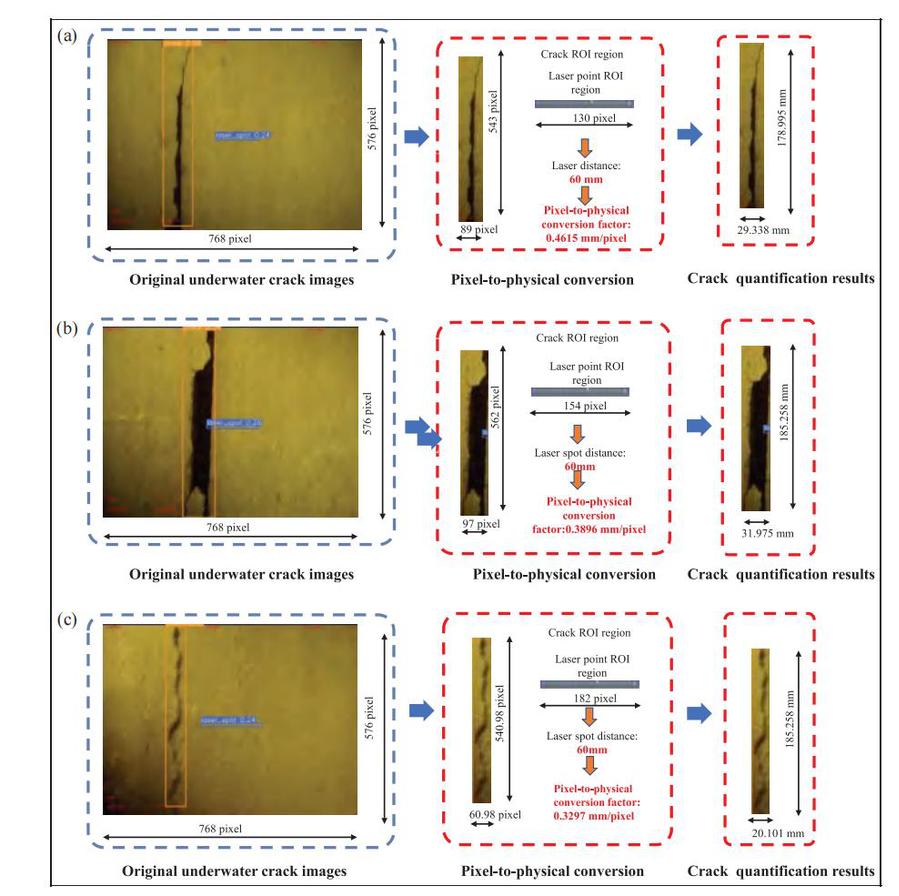 针对结构缺陷尺寸量化的关键需求,结合深度学习目标检测与红外激光测距方法,构建了涉水混凝土结构缺陷的几何参数识别与定量评估模型。研究表明,该方法在遮挡、低照度、浑浊水体等复杂环境中能够稳定提取缺陷尺寸信息,误差控制可满足工程需求。