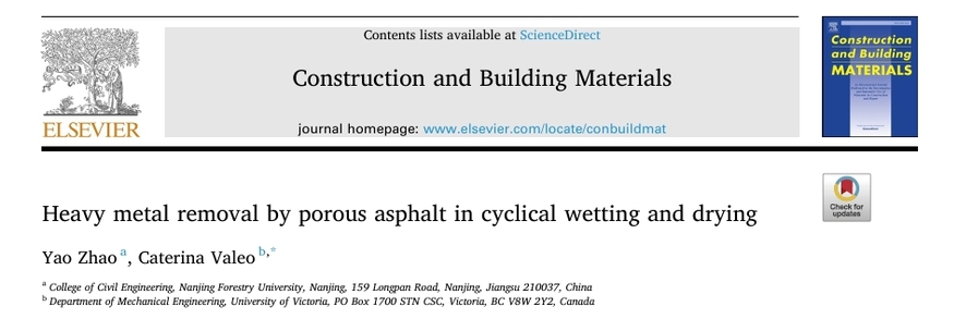 近日,皇冠博彩网址 赵曜副教授与加拿大维多利亚大学Caterina Valeo教授团队合作,在极端气候条件下透水路面铺装技术研究中取得进展。研究成果发表于国际权威期刊《Construction and Building Materials》,揭示了多孔沥青路面(PAP)在动态气候条件下对雨水中溶解态重金属的高校净化潜力,为城市雨水管理提供了可行解决方案。