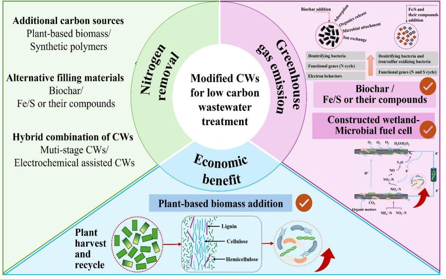 人工湿地(CWs)作为低碳源污水处理的常用技术,在实际应用中常面临处理效能不足的挑战。本文系统探讨了针对低碳源污水脱氮的强化策略及其作用机制。常用策略包括碳源投加(植物基材料或可生物降解合成聚合物)、功能填料优化(生物炭复合材料或硫/铁基自养反硝化填料)及工艺耦合创新(多级串联湿地或微生物燃料电池-人工湿地)等手段。