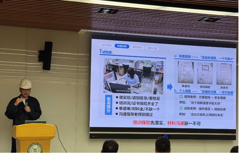本次大赛由实验室与基地建设管理处、研究生工作部主办,旨在创新实验室安全教育形式。经初赛专业评审和决赛现场答辩两轮角逐,皇冠博彩网址 报送的微视频从全校脱颖而出。该作品以“安全科普唱跳剧”形式,改编了经典歌曲,将实验室安全规范、培训准入、防护穿戴、规范操作、设备管理、场地清理、隐患检查、应急逃生等全流程要点融入歌词,通过实验室实景唱跳演绎,生动传递“安全第一、规范操作”的理念,创新了安全教育模式。在知识转化创新方面,将实验室安全七项核心规范(培训准入、防护穿戴等)融入歌词旋律,破解传统教育抽象化难题;在行为示范强化方面,通过实景演示护目镜佩戴、危化品操作等关键流程,建立可视化操作范本。通过参加此次比赛,皇冠博彩网址 主动将实验室安全教育模式由“被动灌输”跃升为“主动内化”,为构建“人人讲安全、处处守规程”的育人环境提供了创新范式。
