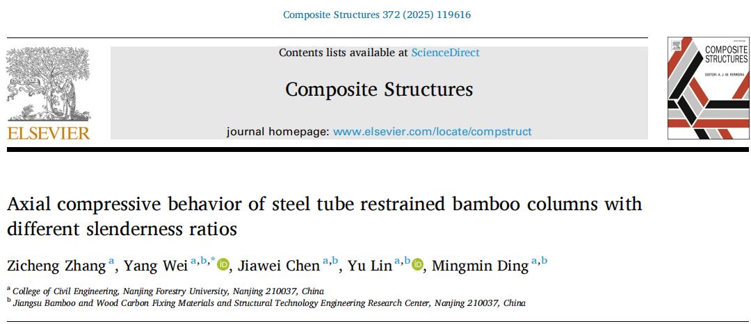 近日,皇冠博彩网址 魏洋教授课题组在复合材料与力学领域顶级期刊《Composite Structures》(JCR 1区;影响因子:7.1)上发表了重要研究成果(Axial compressive behavior of steel tube restrained bamboo columns with different slenderness ratios)。南京林业大学为第一完成单位,魏洋教授为通讯作者,博士生张子诚为第一作者。成果获得了国家自然科学基金项目、江苏省自然科学基金项目等资助。
