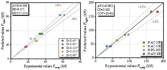 论文得出以下主要结论:(1)纯剪切-拉伸销栓可有效激发销栓与混凝土之间的锚固作用,显著提升抗剪承载力和滑移模量;而纯剪切-压缩销栓虽具备较好的延展性,但抗剪承载力和滑移模量相对较低。(2)通过预制的方式在槽口处后浇HSG和UHPC可大幅提升连接件的抗剪承载力,分别是现浇试件的2.27和3.15倍。(3)无论是销栓型连接还是槽口型连接,采用UHPC板均可大幅提高连接件的抗剪性能。在试验结果的基础上,对各类连接件的抗剪承载力进行了理论推导并建立了相应的解析模型。