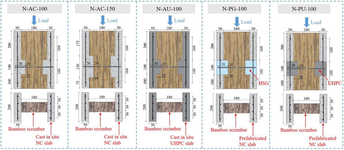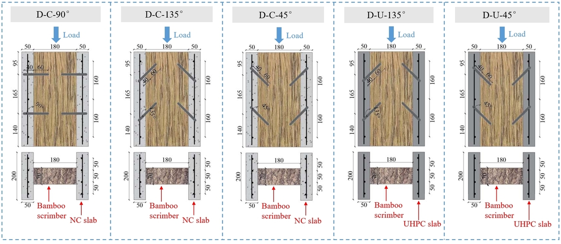 竹-混凝土复合(BCC)结构是将现代胶合竹材与混凝土组合形成的一种新型组合结构,其通过多种材料组合改善竹结构本身的一些不足,发挥竹材的可持续性、环保性。竹-混凝土之间相互连接的抗剪连接件是确保BCC结构形成整体,充分发挥性能优势和结构稳定的关键。为此,团队探索了两类竹-混凝土连接件(销栓型和槽口型),对其进行了系统的试验与分析。销栓型试件的变量包括销栓倾角(45°,90°和135°)和混凝土板类型(NC板和UHPC板);槽口型试件的变量包括槽口长度(100 mm和150 mm)、混凝土板类型(NC板和UHPC板)及浇筑工艺(现浇与预制)。