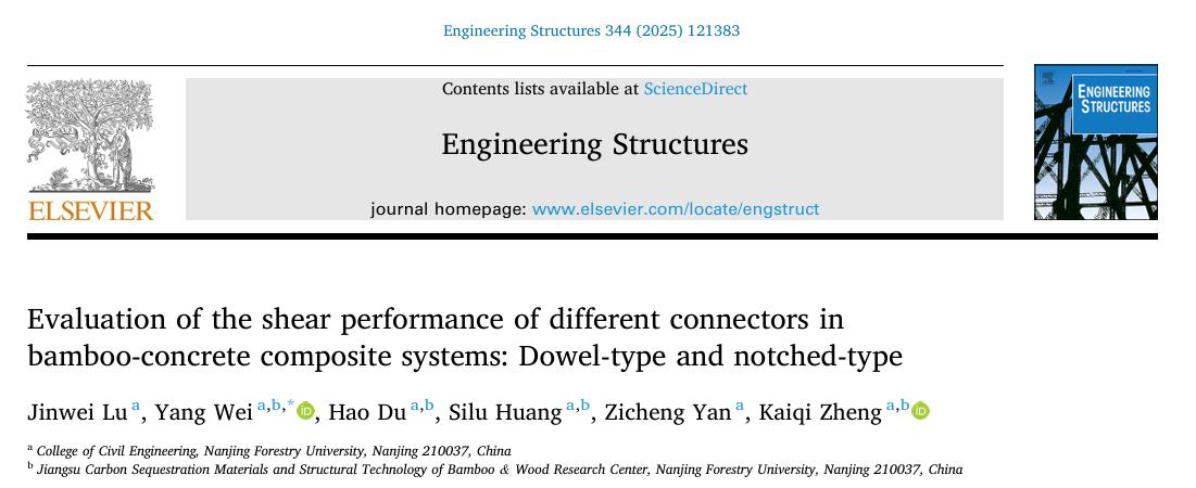 近日,皇冠博彩网址 魏洋教授团队在结构工程领域国际权威期刊《Engineering Structures》(中科院一区Top)发表了研究成果(Evaluation of the shear performance of different connectors in bamboo-concrete composite systems: Dowel-type and notched-type。研究生陆金炜为第一作者,魏洋教授为通讯作者,我校为第一完成单位。该成果得到了国家自然科学基金和江苏省自然科学基金等项目的资助。