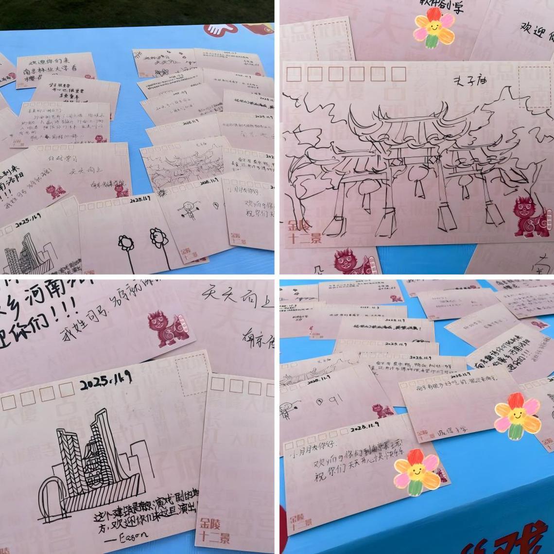 在互动环节,志愿者特别发起了一项主题为“请写下一句话,请留下一幅画”的公益活动,鼓励青少年、小朋友们在具有南京特色的“南京十二景”明信片上,为即将前往的支教地孩子们留下祝福或介绍南京的美食和景色。参加活动的孩子们积极投入,从幼儿园的小朋友到初中生,有的用稚嫩的画笔画出花朵,有的描绘南京地标,还有的写下一句句真诚的期盼:“期待有机会你们来南京玩!”这些温暖的声音和画面,通过小小的明信片传递着南京的爱。志愿者们建议孩子们留下他们的姓名和学校,希望这份署名的祝福能够顺利地送达支教地孩子们的手中。