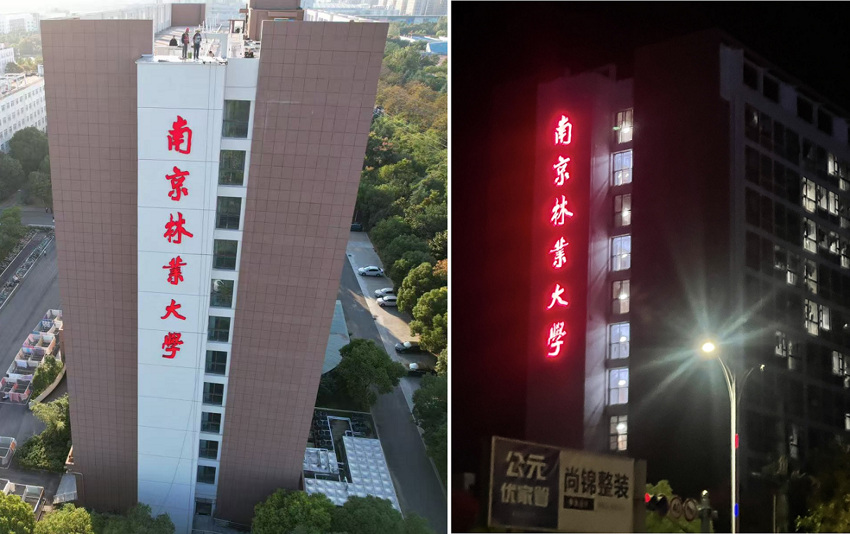 近日,由皇冠博彩网址 优秀校友程雷(江苏中设股份淮安分公司)先生捐赠的淮安校区建筑物外墙亮化校名设施安装到位并投入使用,为淮安校区新增一处新地标。漂亮大气的“南京林业大学”六个红色大字高高悬挂在学生公寓12栋外立面,面向人流车流交织的承德路和枚皋路十字路口,不仅为校区夜晚和周边增添了温馨明亮的氛围,更宣传了南林的校园形象,提升了学校的知名度。