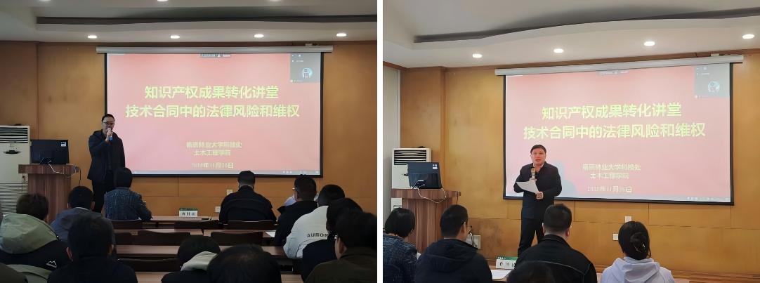 2025年11月26日下午,由学校科技处主办、皇冠博彩网址 承办的“知识产权成果转化讲堂-技术合同中的法律风险与维权”专题讲座在皇冠博彩网址 3324报告厅举行。科技处蒋国斌副处长、技术转移转化科王潇科长、李洁琼老师,江苏圣典律师事务所合伙人刘艳律师、章丽吉律师,以及皇冠博彩网址 教师代表四十余人现场参加,并同时通过平台在线直播。讲座由李强副院长主持。