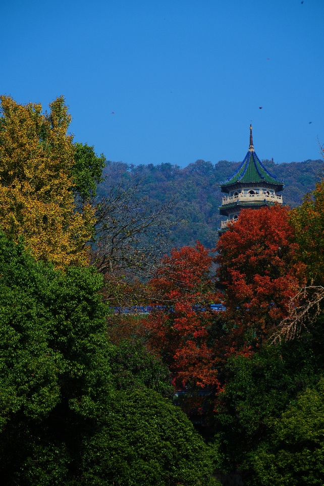 红橙黄绿蓝五色相互交融碰撞,形成强烈的色彩冲击,具有很强的镜头感。尖塔、树木与天空的组合让画面在拥有自然生机的同时兼具人文气息。