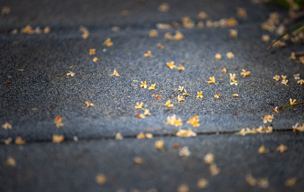 随意散落在地的桂花营造清冷气氛,虚实相生的摄影手法使画面详略得当,一眼深秋。