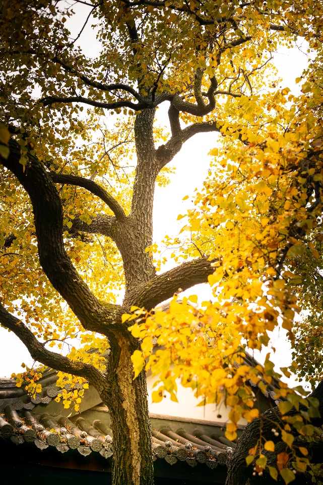 选取仰望视角,青黑色瓦片上衬盘根错节的古树,深秋气息扑面袭来。