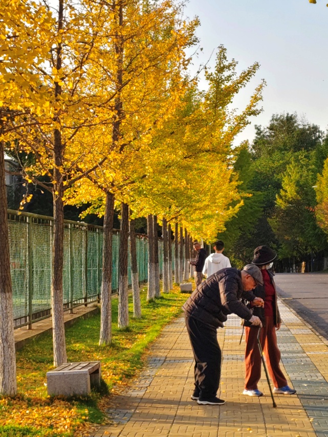 散落一地的金叶、相互搀扶的老人、出行游玩的父子,自然美与人情美相得益彰。