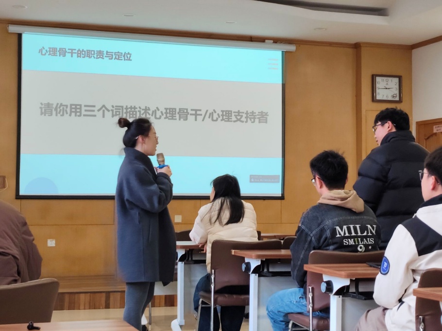 王月老师分三部分向大家普及了相关心理健康知识,包括心理骨干的职责与定位、心理骨干的工作技巧,以及心理健康与心理咨询,系统全面地介绍了心理骨干应具备的能力,心理求助及心理救助的科学方法,帮助大家明确自身职责、清晰自身定位,到场的同学们听后受益匪浅。