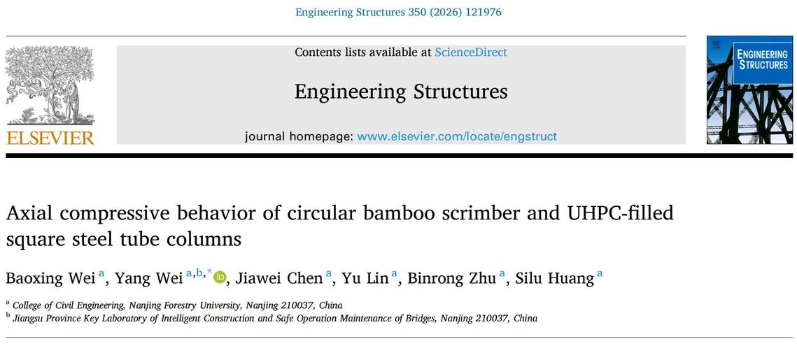 近日,皇冠博彩网址 魏洋教授课题组在土木工程领域国际著名期刊《Engineering Structures》(中科院一区Top,IF = 6.4)发表了重要研究成果(Axial compressive behavior of circular bamboo scrimber and UHPC-filled square steel tube columns),南京林业大学为第一完成单位,魏洋教授为通讯作者,博士生韦宝幸为第一作者。成果获得了国家自然科学基金项目、江苏省自然科学基金项目等资助。