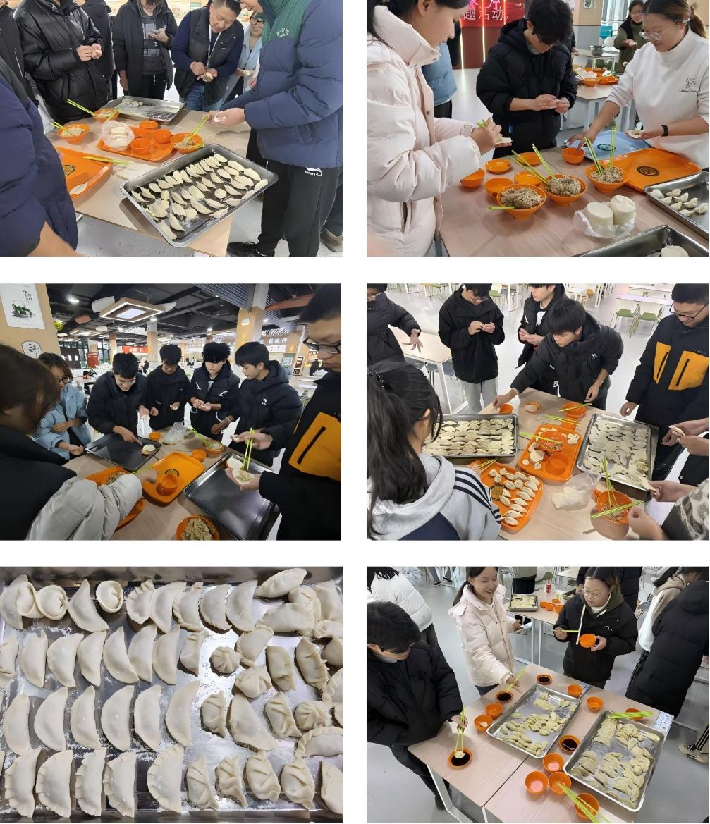 活动现场暖意融融,食堂内整洁有序,面皮、馅料、擀面杖等各类工具一应俱全,为同学们的创作之旅做好了充分准备。活动中,同学们分工明确、默契配合,取皮、放馅、捏褶,一系列动作行云流水。经验丰富的同学化身“青春导师”,主动向初次尝试的同学传授技巧。从面皮厚薄把控到馅料用量调节,细致入微地指导让一个个形态各异却饱含心意的饺子陆续成型。现场还增设了趣味互动环节,同学们一边忙碌一边交流家乡的冬至习俗,分享校园生活趣事,擀皮声、笑语声、指导声交织成最动听的青春乐章,随着一个个饱满的饺子摆满餐盘,欢乐氛围持续升温。当日午后,一锅锅热气腾腾的饺子新鲜出锅,香气弥漫整个食堂。同学们围坐一堂,满怀欣喜地品尝着自己的劳动成果,鲜香的馅料与软糯的面皮在口中交融,驱散了冬日的寒意。