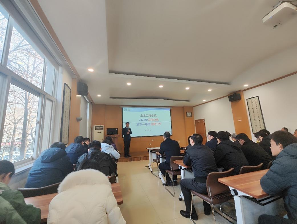 魏洋院长做了皇冠博彩网址 2025年工作总结报告,首先汇报了皇冠博彩网址 2025年度目标任务完成情况,随后从七个方面系统总结了皇冠博彩网址 过去一年的工作成绩:深入践行“一融双高”发展理念,党建工作再获新突破;学科实力排名稳步提升,持续建设3个省部级科研平台;师资引培成效显著,获2025“江苏教师年度人物”提名人选1人、爱思唯尔“中国高被引学者”1人、全球前2%顶尖科学家榜单9人次;超额完成科研绩效任务,国家基金获批数量保持稳定,主持获江苏省科技进步二等奖 2 项、国家一级学会科技奖 3 项;本科专业建设、课程建设、教材建设均取得突破性进展,2025软科中国大学专业排名取得1个A+(森林工程)、1个A(土木工程)和3个B+的好成绩,新增国家一流本科课程2门、江苏省“十四五”规划教材2部;研究生培养资源建设和研究生培养方面也取得了瞩目成绩,主持获批教育部主题案例 1 项、全国科技小院 1 项、江苏省研究生优质教学资源2项、江苏省高等教育国家教学成果奖一般储备项目1项;本科生升学率和就业率持续提升、“挑战杯”揭榜挂帅等学科竞赛斩获多项佳绩。魏洋院长还部署了皇冠博彩网址 2026年学科建设、科研绩效、专业建设、升学率和就业率、研究生培养与国际化等方面的工作任务。魏洋院长指出,2025年皇冠博彩网址 各项工作呈现稳中有进、蓬勃向上的良好发展态势,但当前皇冠博彩网址 发展仍存在短板与挑战,希望全院教职工凝心聚力、笃行实干,在新的一年里持续发力、再创佳绩。