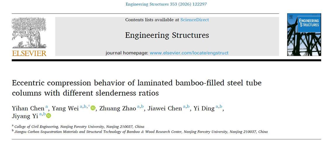 近日,皇冠博彩网址 魏洋教授课题组在土木工程领域国际著名期刊《Engineering Structures》(中科院一区Top,IF = 6.4)上发表了题为“Eccentric compression behavior of laminated bamboo-filled steel tube columns with different slenderness ratios”的重要研究成果。该论文以南京林业大学为第一完成单位,魏洋教授为通讯作者,硕士生陈奕涵为第一作者,并获国家自然科学基金项目资助。