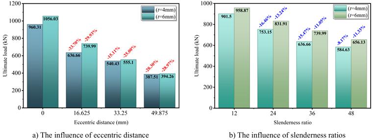 针对这一问题,课题组采用“试验研究+数值模拟”相结合的方法,系统揭示了LBST柱在偏心受压状态下的力学性能与破坏机理。研究完成了28个LBST试件的单轴偏心受压试验,重点分析了长细比(λ)、相对偏心率(e0/D)和钢管壁厚(t)等关键参数对极限承载力、破坏模式及延性的影响。为进一步拓展参数范围,建立了高保真的有限元(FE)模型,开展了74种工况的参数化分析,验证了模型在广泛参数空间内的可靠性。
