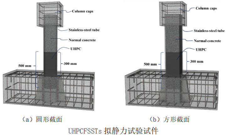 课题组系统开展了UHPCFSSTs的结构性能与受力机理研究。本研究设计了4个圆形与4个方形试件进行拟静力试验,并基于数值模拟拓展分析了15个圆形与15个方形试件,系统研究了在恒定轴压与往复侧向荷载共同作用下的抗震性能。重点揭示了截面形状、含钢率、轴压比等关键参数对试件破坏模式、滞回曲线、刚度退化、耗能能力及延性等性能指标的影响规律,阐明了不锈钢管与UHPC之间的协同耗能机制与疲劳特性。研究结果表明:试件主要于塑性铰区域发生压弯破坏;轴压比增大会加剧卸载刚度退化;侧移率提高有助于增强耗能能力;含钢率增加可提升圆形截面柱的延性。在此基础上,研究建立了峰值荷载与位移预测模型,开发了稳定的滞回准则,最终系统构建了适用于圆形与方形UHPCFSSTs的统一抗震恢复力模型。