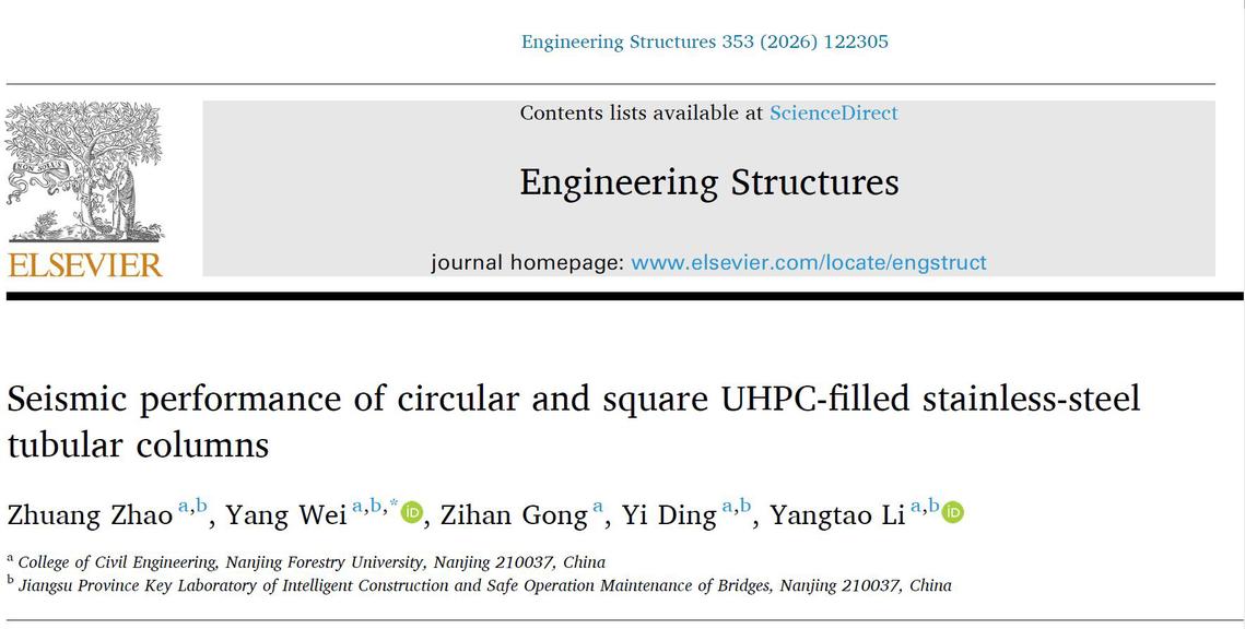 近日,皇冠博彩网址 魏洋教授课题组在土木工程领域国际著名期刊《Engineering Structures》(中科院一区Top,IF=6.4)上发表了题为“Seismic performance of circular and square UHPC-filled stainless-steel tubular columns”的研究论文。该成果以南京林业大学为第一完成单位,魏洋教授为通讯作者,赵状老师为第一作者,并获国家自然科学基金项目资助。