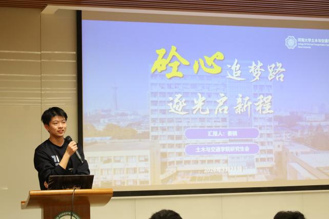 3月25日的交流活动设置学术汇报、学生会工作分享两个核心环节。科研汇报环节,我校校友、现河海大学土木与交通皇冠博彩网址 2026级岩土工程博士研究生谢善尧,分享了他在岩土工程多场耦合试验与数值模拟领域持续探索的科研历程与心得体会,其关于复杂地质条件下隧道工程稳定性分析的研究成果为在场同学提供了新的研究思路。南京林业大学李叡同学结合自身在木结构抗震方向的科研实践,围绕学术研究中的问题发现、方法创新与成果转化等方面进行了深入分享,充分展现了南林土木学子精益求精、奋勇争先的学术态度。