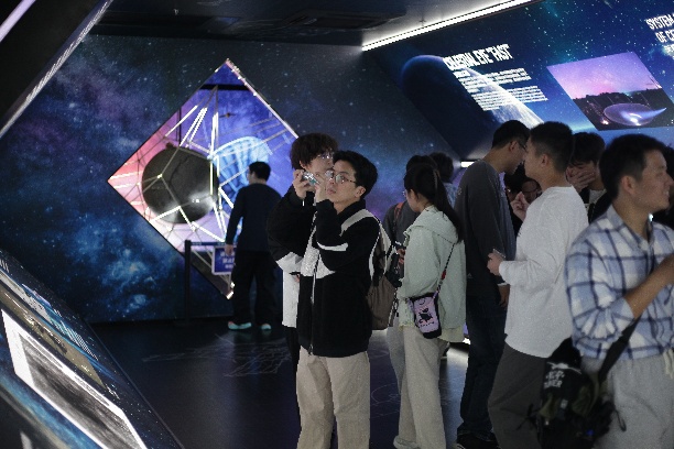 随后测绘工程专业师生参观了浙江德清地理信息科技馆,在讲解员的引导下,同学们沿着时空长廊,系统地了解测绘技术的发展历程:从东汉张衡发明的“浑天仪”、“地动仪”,到近代光学测量仪器,再到当代无人机航测、卫星遥感等前沿技术。展馆巧妙地运用沉浸式互动技术,通过三维全息投影、模拟驾驶、巨型球幕视频,同时结合VR、MR互动等多种科技手段,不仅让同学们感受到智能测绘技术的魅力,更让同学们认识到智能测绘能够让我们的生活更加美好。